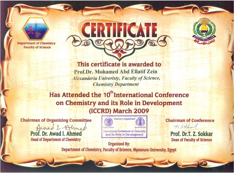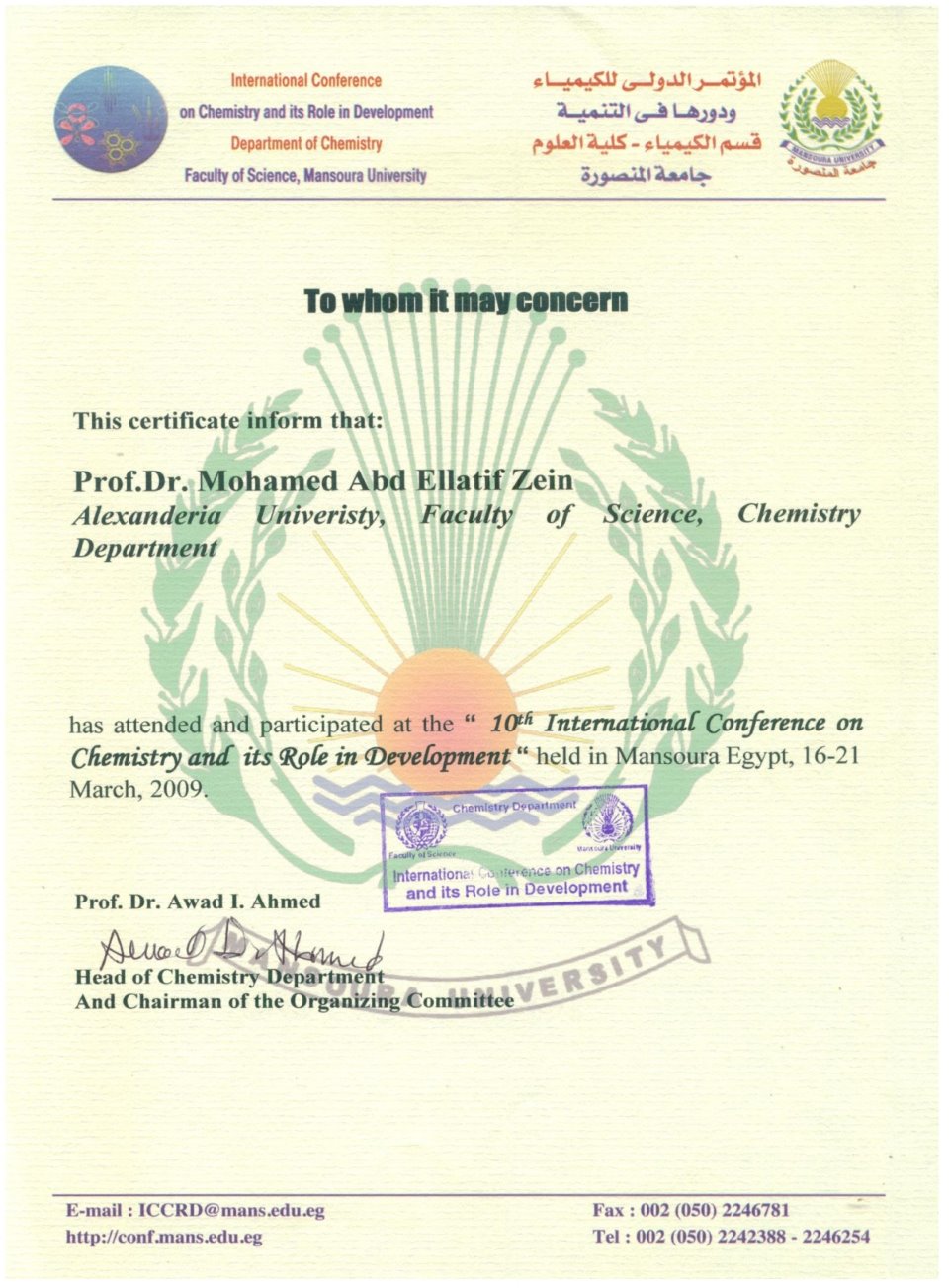 Participation in the 10th International Conference on Chemistry and Its Role in Development, which was held at the Royal Palace Hotel in Sharm El-Sheikh and Mansoura University on 16-21/3/2009, and Presenting a paper entitled: “Synthesis, Mass Spectra and Antimicrobial Activity of Some Nitrogen Heterocycles”