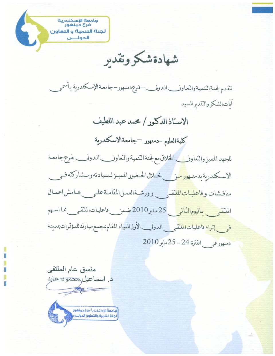 Participation in the First International Water Conference organized by the Committee for Development and International Cooperation at Alexandria University)Damanhour Branch( Egypt on 24-25/5/2010