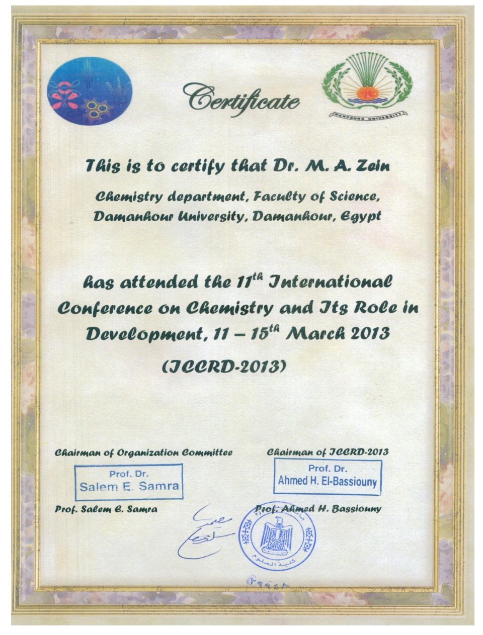 Participation in the 11th International Conference on Chemistry and Its Role in Development, which was held in Sharm El Sheikh and Mansoura University on 10-15/3/2013 and Presenting a paper entitled: “Antimicrobial activity and mass spectra investigation of prepared nitrogen Heterocycles”