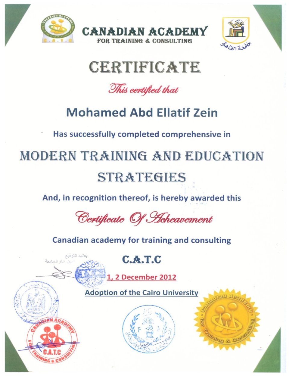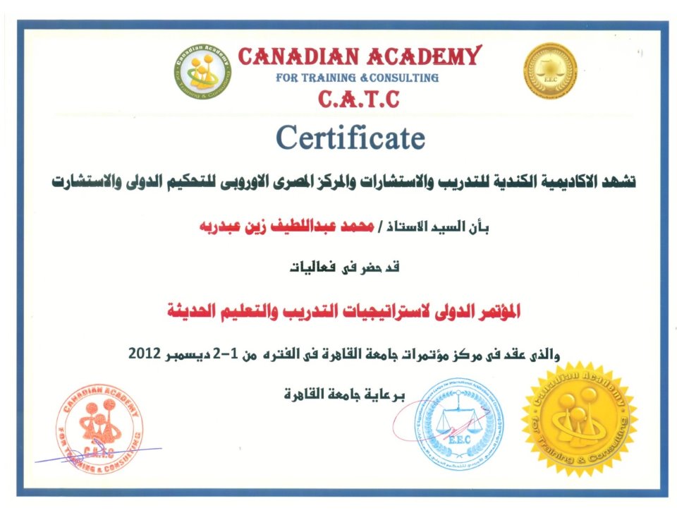 Participation in the International Conference on Modern Training and Education Strategies which was held in the Conference Center at Cairo University, organized by Cairo University, the Canadian Academy for Training and the Egyptian European Center for International Arbitration and Consultation on 1-2/12/2012