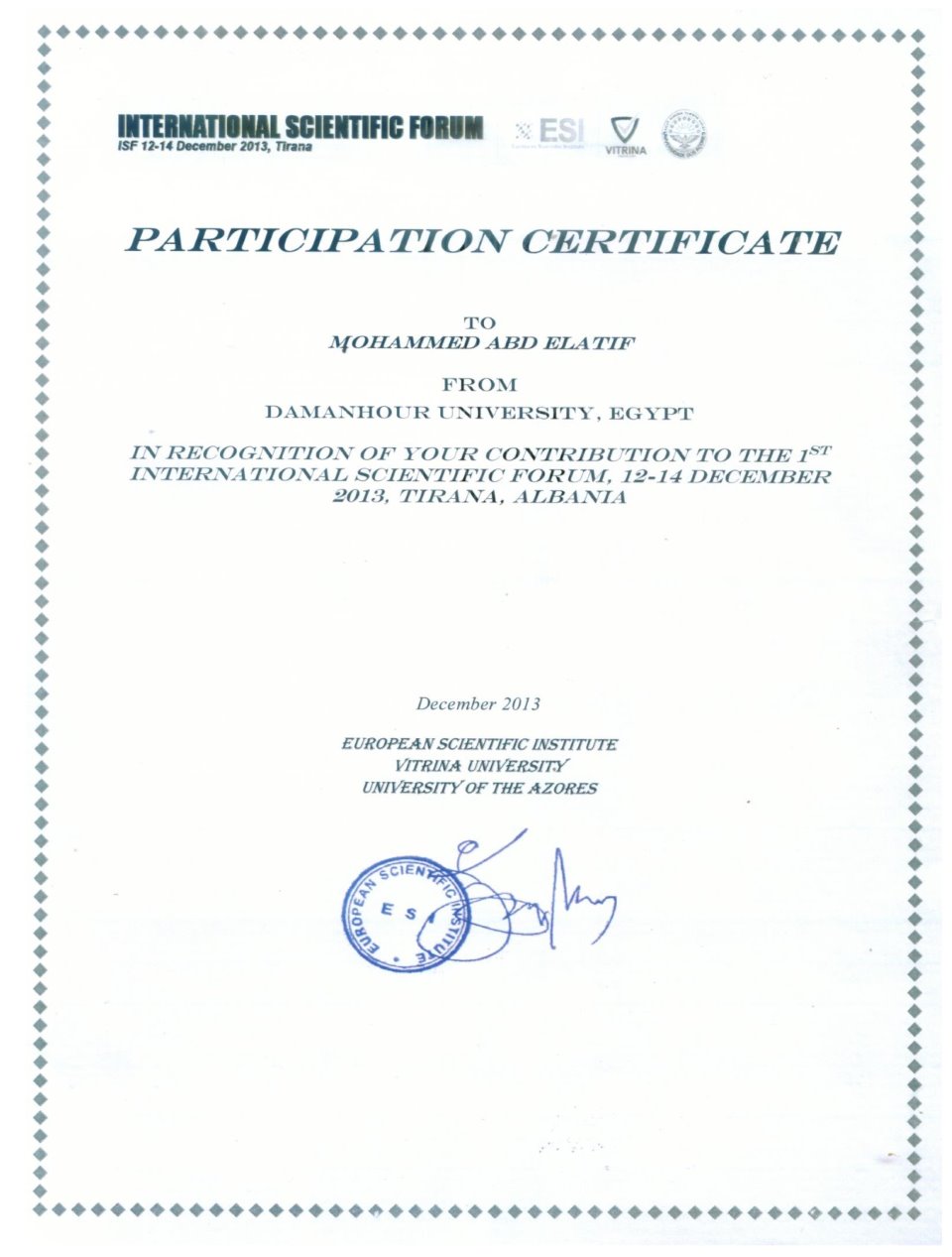 Participation in the first international scientific conference held in Tirana - Albania on 12-14/12/2013 by Presenting a paper entitled: “Aminolysis of Z-4-furylidene oxazolin-5-one derivatives Configuration and Kinetics”