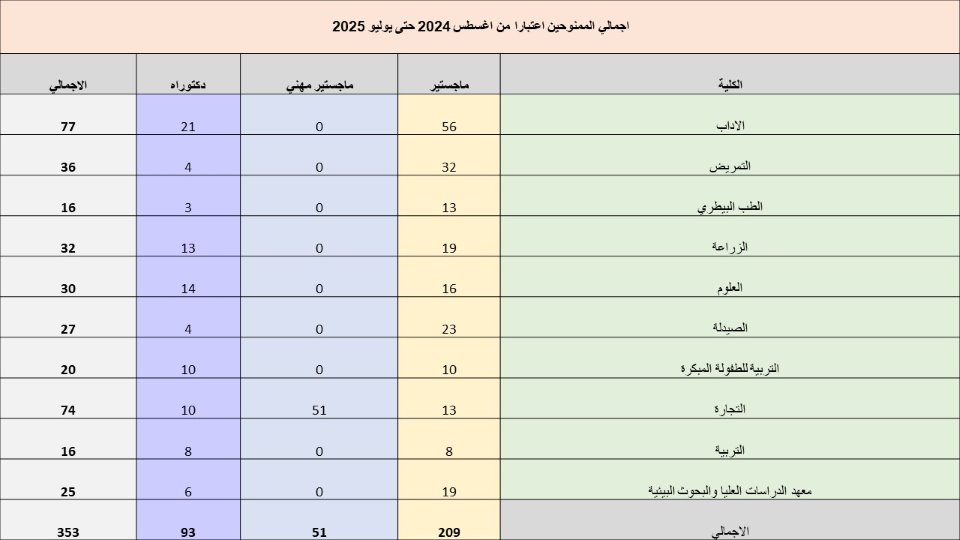 بيان عددى بالمسجلين بالماجستير والدكتوراه من أغسطس 2024 حتى يونيو 2025