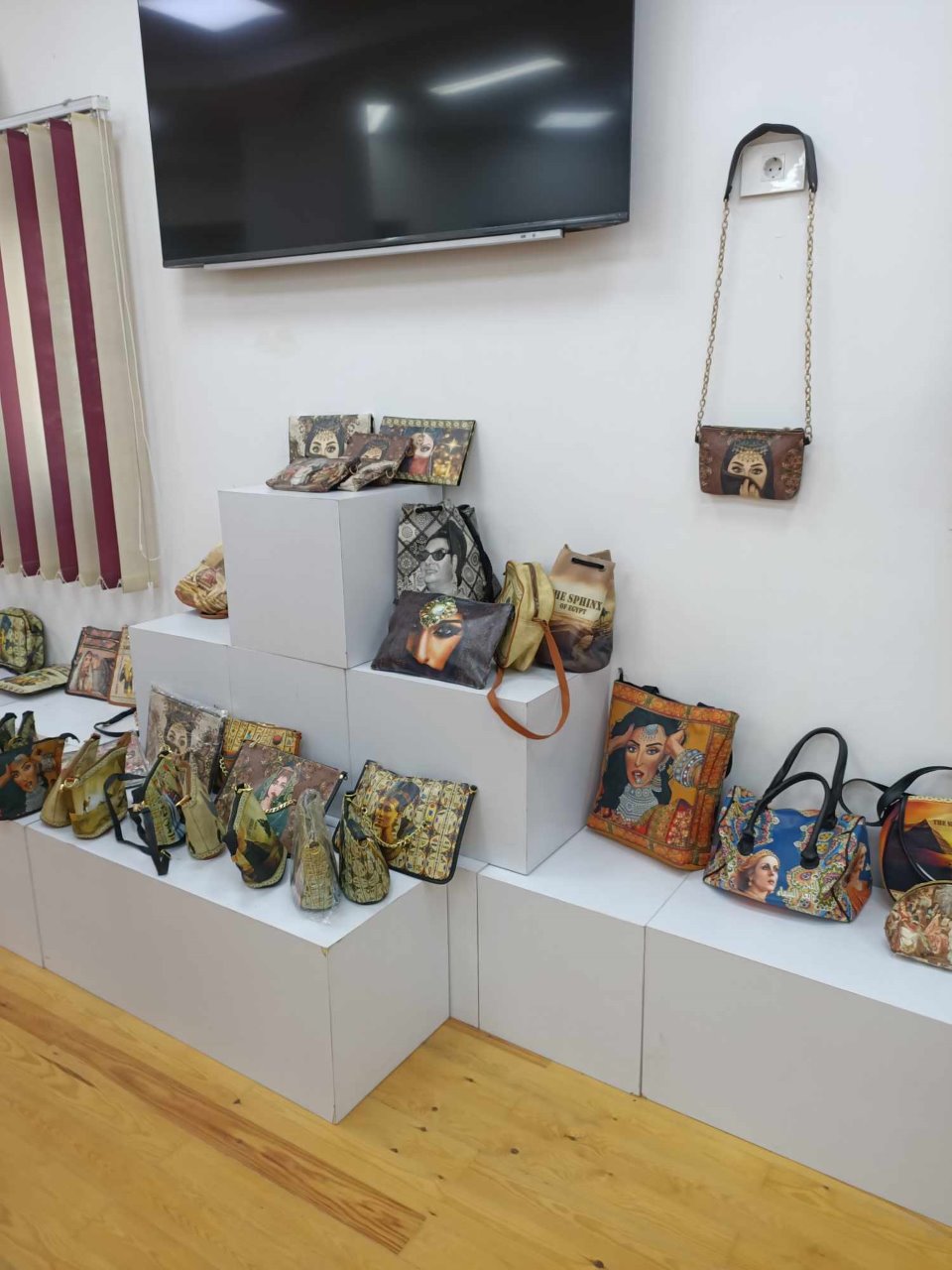 عجينة السيراميك – بالإضافة إلى شنط من القماش والجلد مشغولة بأشكال التراث المصرى الفرعونى ) .