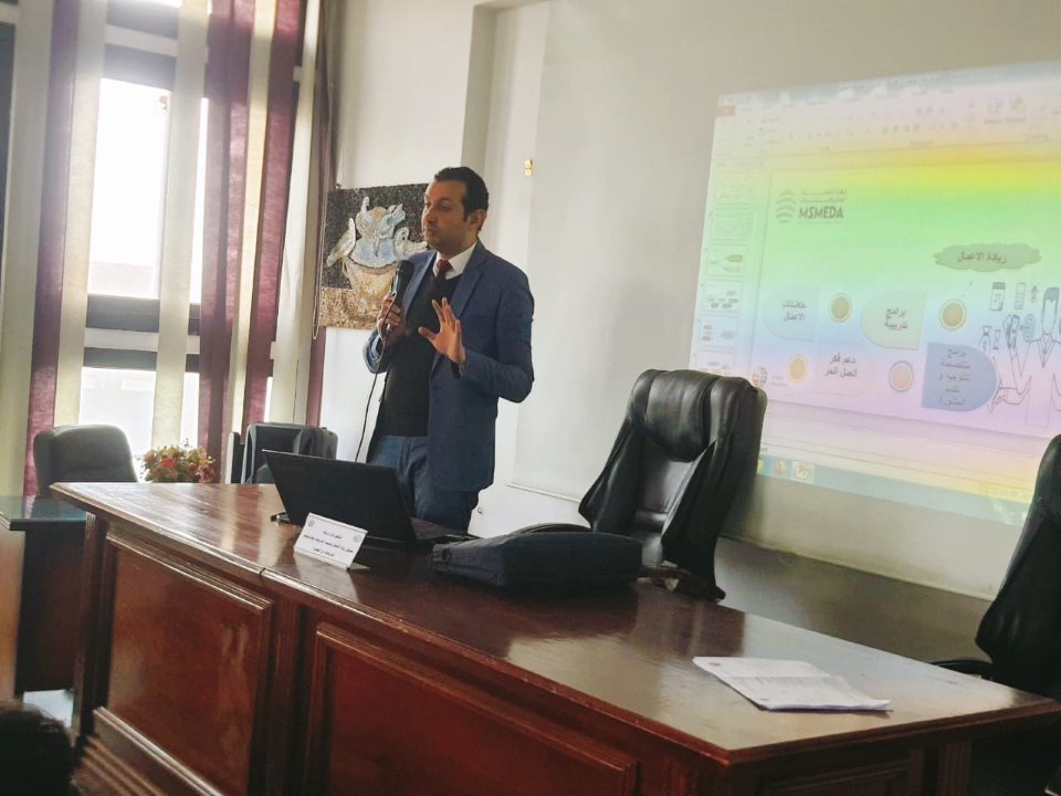 واستعرض أ/ وائل دربالة دور جهاز تنمية المشروعات وما يقدمه من دعم وخدمات لرواد الأعمال ودعم للمشروعات والتعريف بخدمات الجهاز المالية و الغير