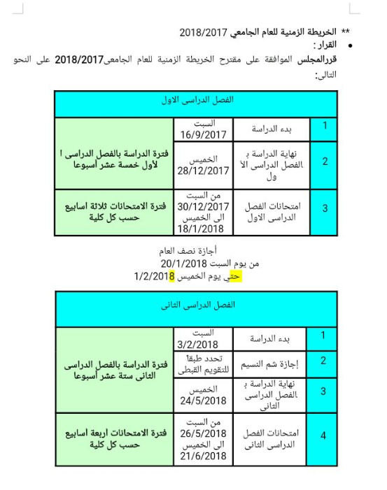 الإعلان عن الخريطة الزمنية للعام الجامعى 2017 - 2018 م