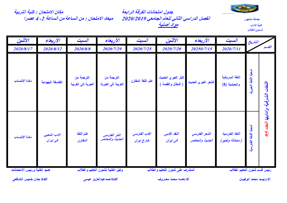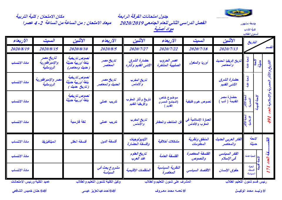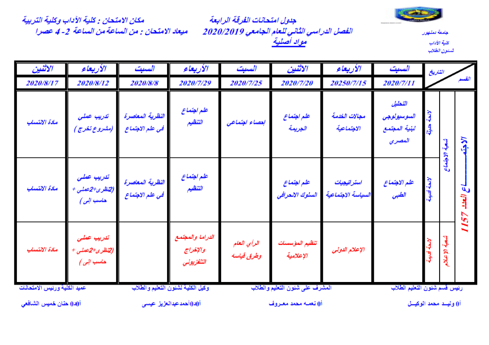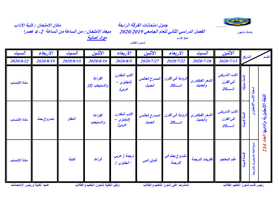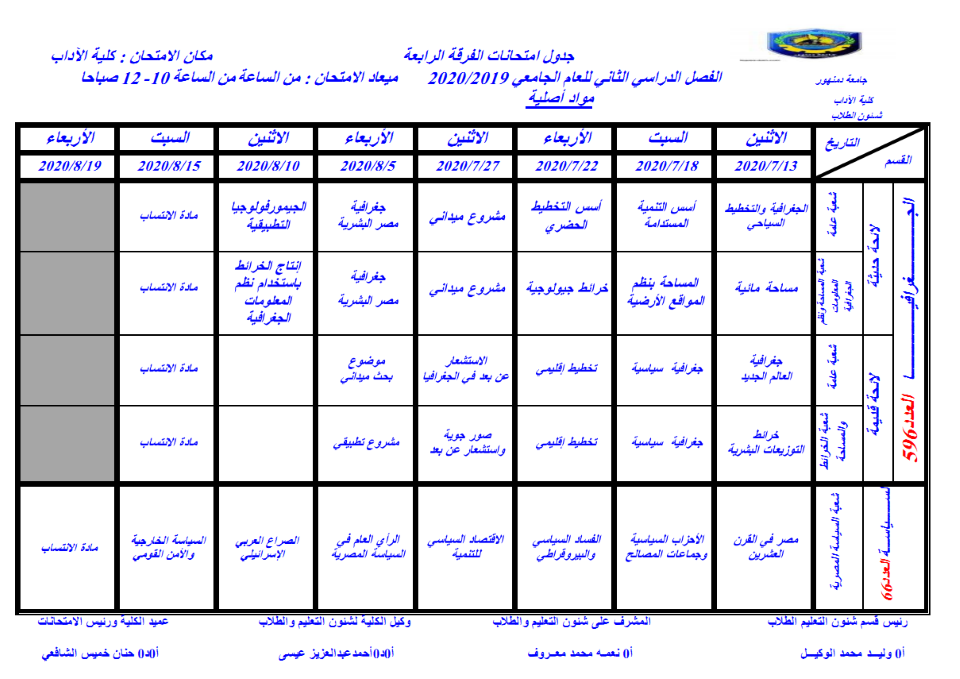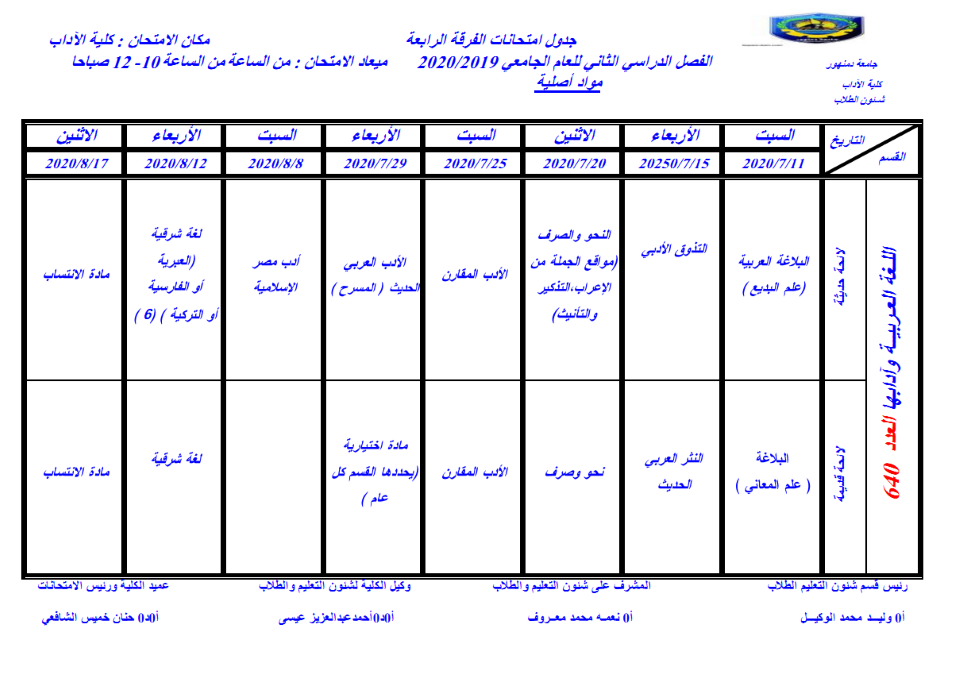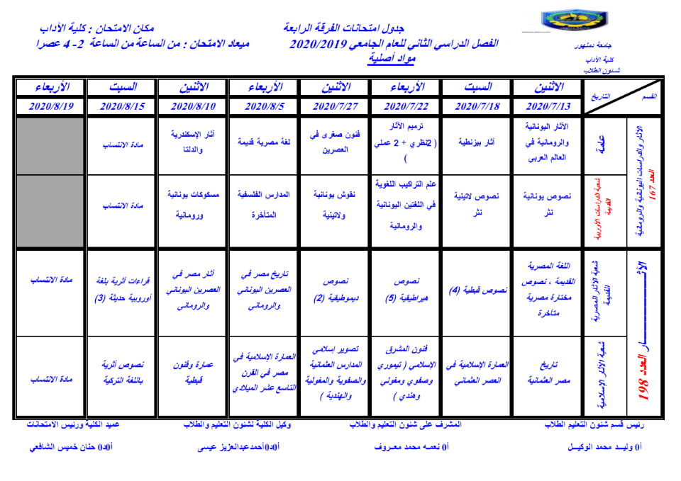 اعتمدت السيدة أ.د/ حنان الشافعى - عميد الكلية والسيد أ.د/ أحمد عبد العزيز عيسى وكيل الكلية لشئون التعليم والطلاب جدول امتحانات الفرقة الرابعة الفصل الدراسى الثانى لجميع أقسام الكلية للعام الجامعى 2020/2019 والتى من المقرر أن تبدأ يوم السبت الموافق 2020/7/11 للاطلاع على الجدول