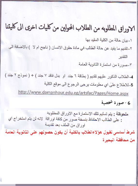 تعلن كلية الآداب جامعة دمنهور عن اجراءات التحويل من كليات اخرى الى كلية الآداب جامعة دمنهور لغير المستجدين للعام الجامعى 2021/2020 وهى كالتالى