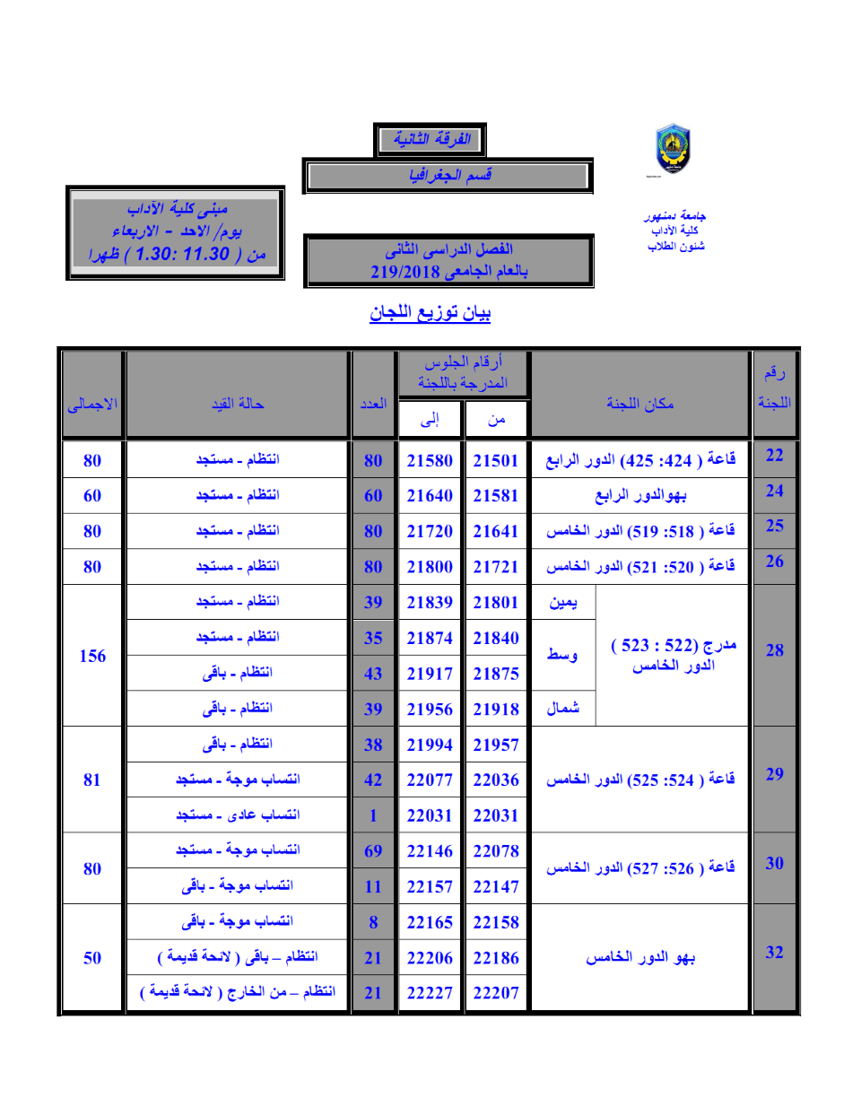 جدول محاضرات الفصل الدراسى الثانى لجميع أقسام الكلية للعام الجامعى 2023/2022