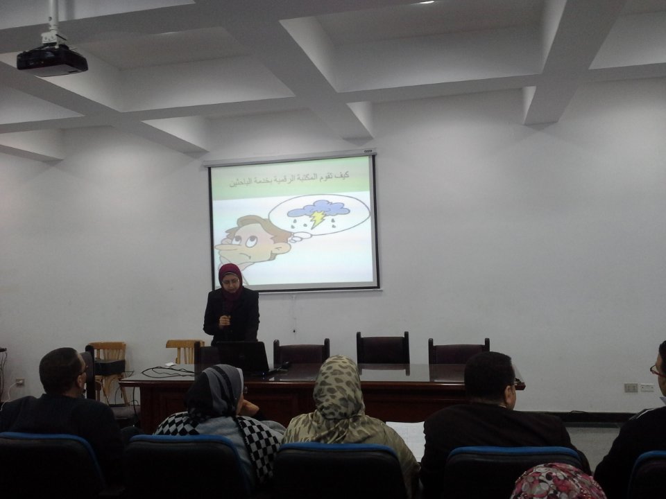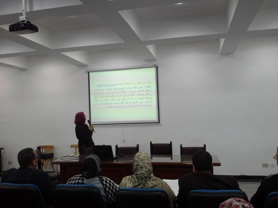 عقدت اليوم الاثنين بتاريخ 10/3/2014 وحدة الخدمات التكنولوجيه بكلية التربيه ندوة تعريفيه لكل كليات مجمع الابعاديه (الاداب و التربيه و الزراعه و التجاره) خاصة بتفعيل المكتبه الرقميه و التي تعد من اهم الانشطة التي تقدمها الجامعة للساده اعضاء هيئة التدريس و الهيئة المعاونه و طلاب الدراسات العليا و الفرق الدراسيه المختلفه و قد عقدت في الساعة الحادية عشر بمقر قاعة المؤتمرات في الدور الثامن بالكليه .