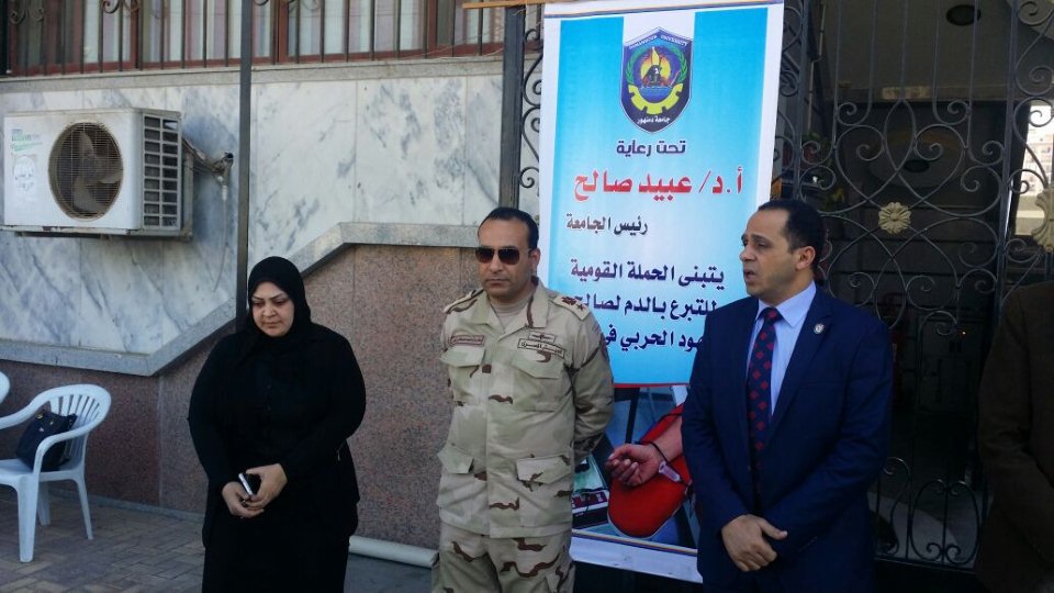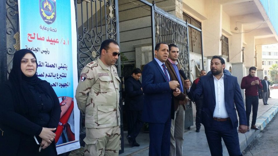 افتتح سيادته حملة التبرع بالدم لصالح المجهود الحربي في سيناء بالتعاون مع إدارة التربية العسكرية ووزارة الصحة بالبحيرة وبمشاركة طلاب الجامعة
