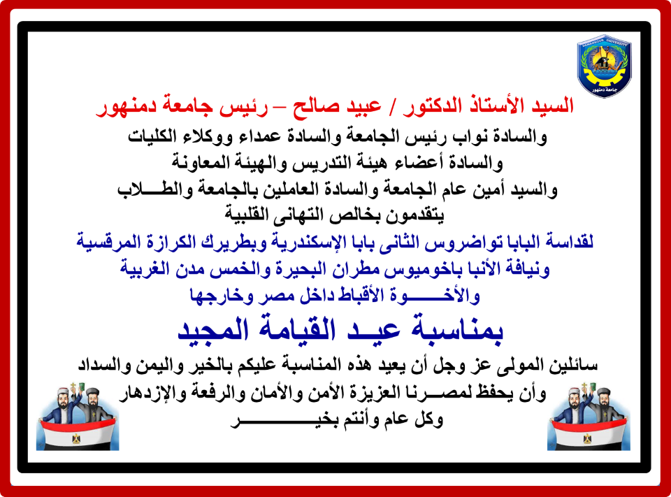رئيس جامعة دمنهور يتقدم بخالص التهانى القلبية للأخوة الأقباط بمناسبة عيد القيامة المجيد