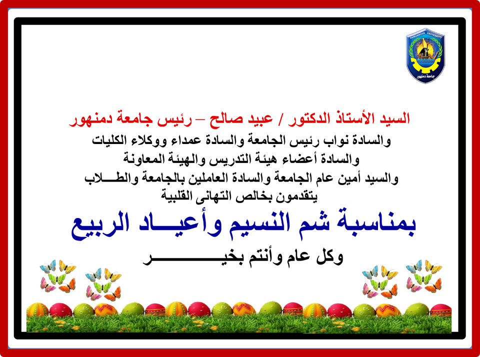 رئيس جامعة دمنهور يتقدم بخالص التهانى القلبية بمناسبة شم النسيم وأعياد الربيع