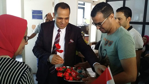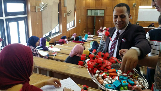 وهذا لمتابعة سير الإمتحانات بالجامعة ورفع الروح المعنوية للطلبة كما قام بتوزيع الورود والأعلام والشيكولاته