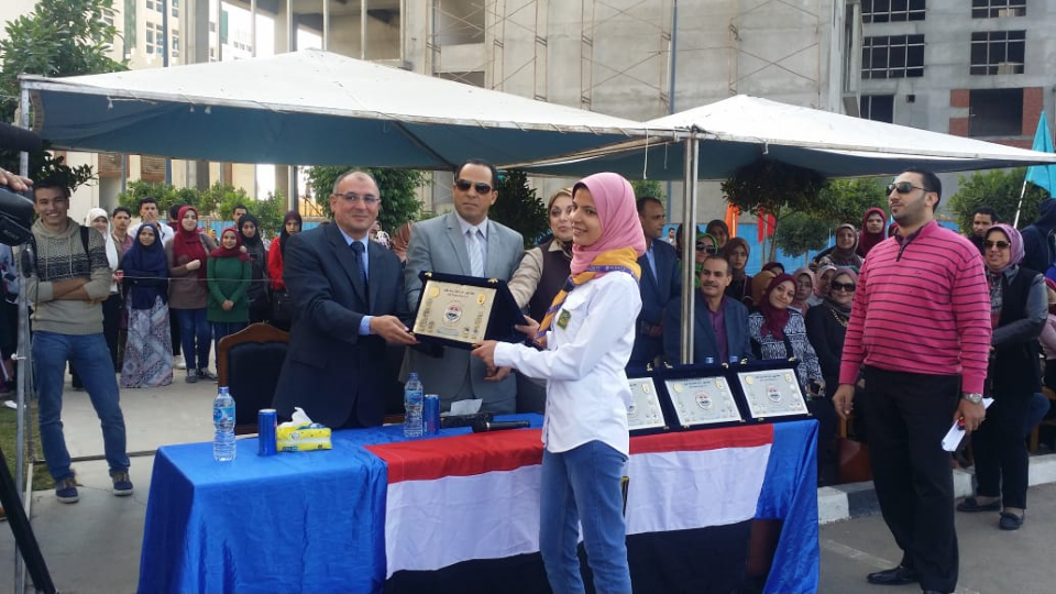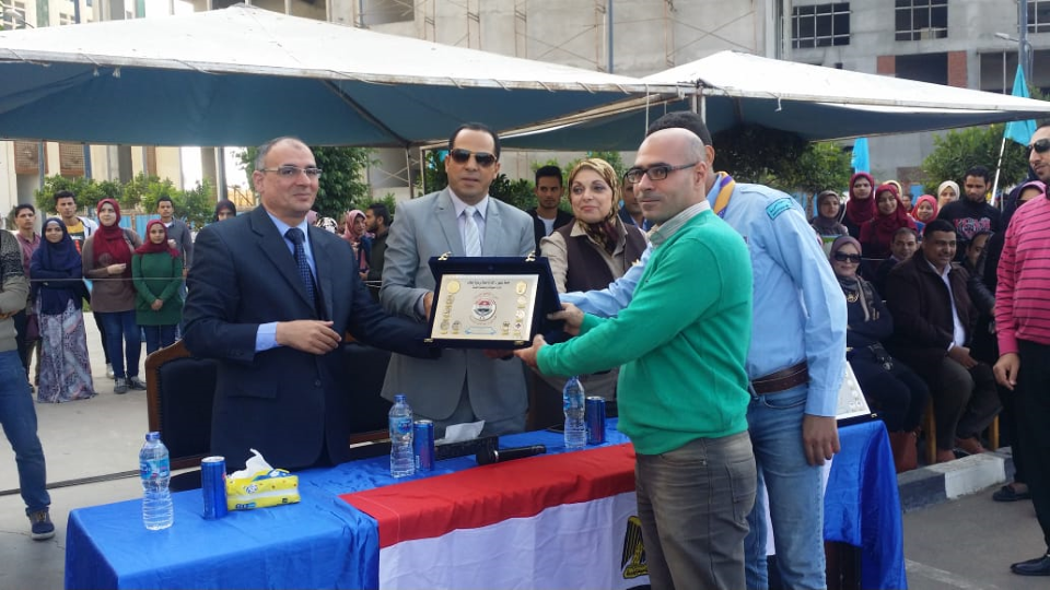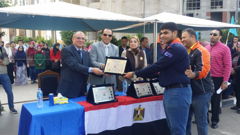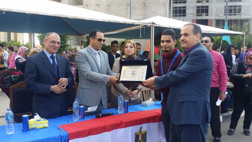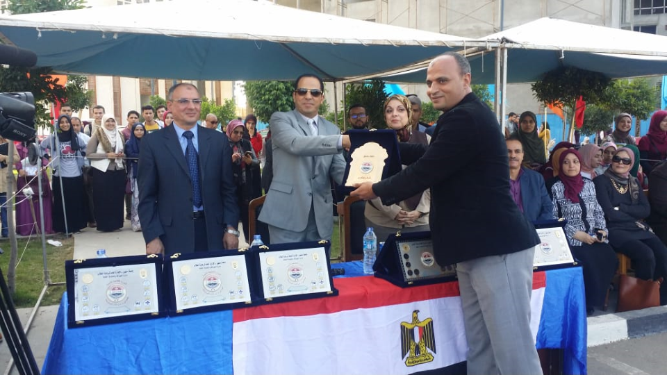 حيث تم تسليم درع الجامعة للأستاذ الدكتور / عبيد صالح ودروع لكل الكليات حيث حصلت كلية الصيدلة على المركز الأول وكلية الزراعة على المركز الثانى