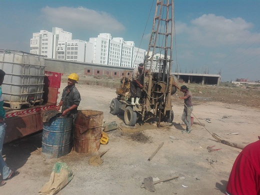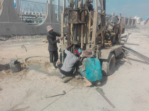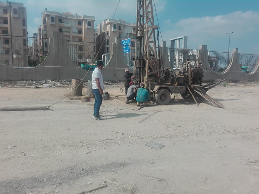 حيث تتم أعمال الحفر والمجسات بالأرض حتى يتم تجهيزها بالمرافق والمعدات اللازمة لرمي الأساسات والخراسانات.