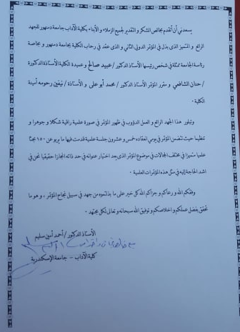 يتقدم الأستاذ الدكتور احمد امين سليم استاذ الآثار بكلية الآداب جامعة الأسكندرية بخالص الشكر والتقدير لجميع الزملاء والأبناء بالكلية للجهد الرائع والمتميز الذى بذل فى المؤتمر الدولى الثانى للكلية وبخاصة رئاسة الجامعة متمثلة فى رئيسها الأستاذ الدكتور عبيد صالح وعميد الكلية الأستاذة الدكتورة حنان الشافعى ومقرر المؤتمر الأستاذ الدكتور محمد ابو على والأستاذة نيفين رحومة امين الكلية