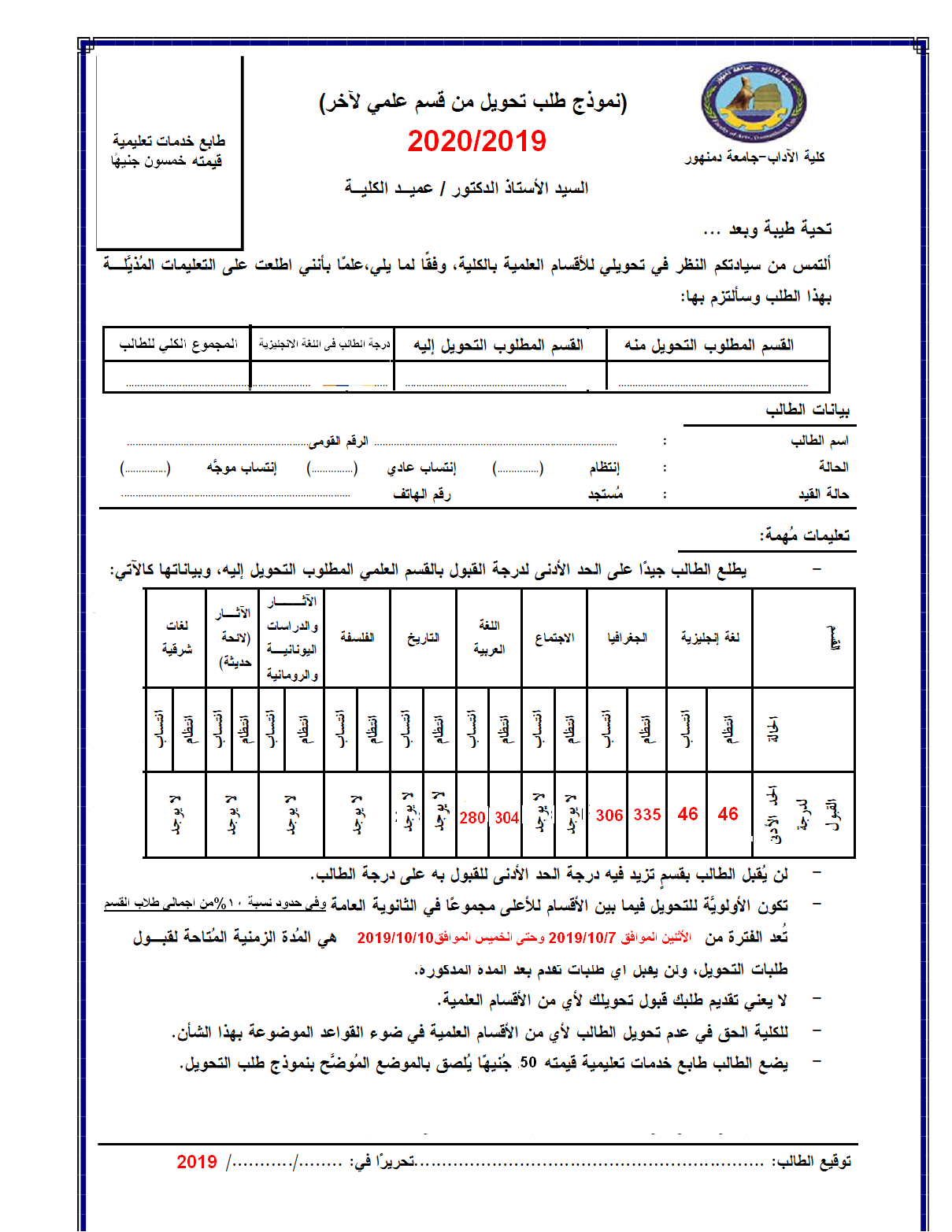 فى عملية التحويل للأعلى مجموعاً وحصول الطالب على الحد الادنى للقبول بالقسم وذلك بأن