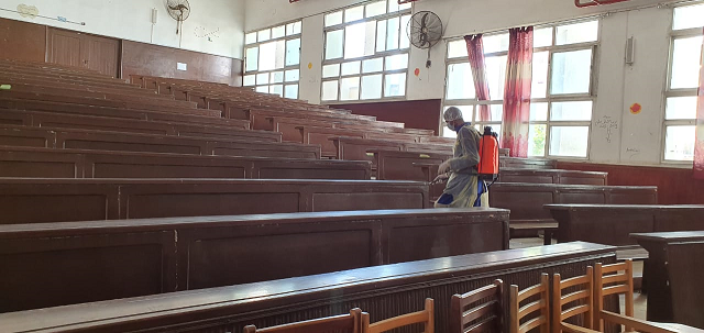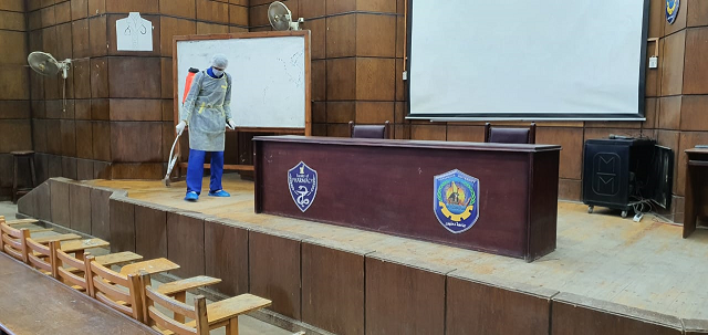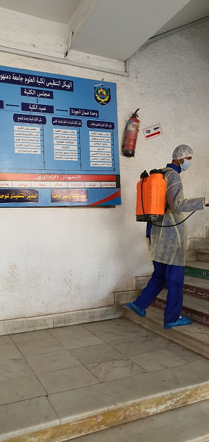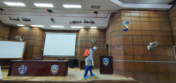 تواصل اليوم جامعة دمنهور أعمال التعقيم والتطهير لجميع مرافق والمباني داخل الكليات من ممرات وطرقات ومناطق دخول الطلاب وقاعات التدريس والمدرجات