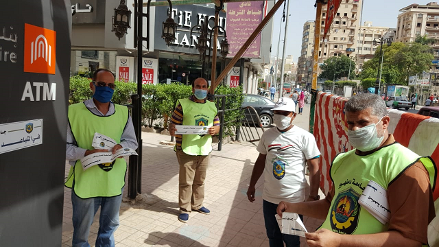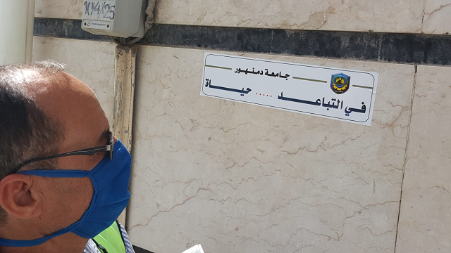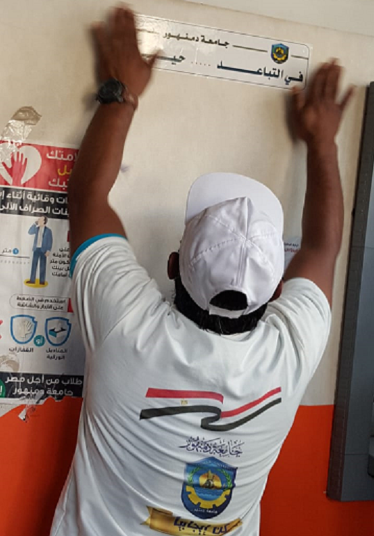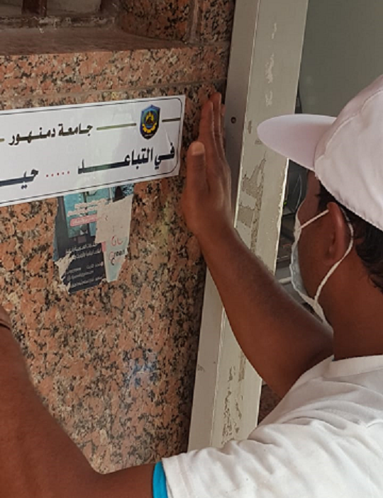 ملصقات توعوية أثناء حملات جامعة دمنهور اليومية فى تطهير وتعقيم شوارع المدينة