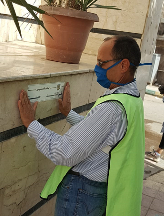 حيث قامت الجامعة اليوم بإعادة تطهير وتعقيم أنحاء واسعة من المدينة شملت جميع البنوك والبريد العمومى والمحلات المجاورة له ومحطة القطار والشوارع المجاورة لنقابة المهندسين