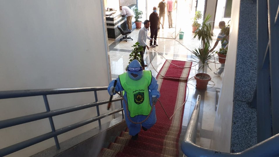 رئيس جامعة دمنهور يعلن إستمرارحملات التطهير والتعقيم لمواجهة فيروس كورونا بالتعاون مع المحافظة