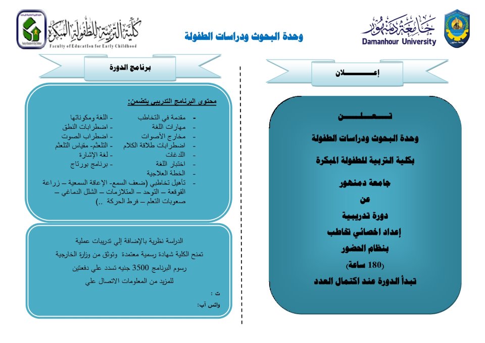 تعلن وحدة البحوث ودراسات الطفولة بكلية التربية للطفولة المبكرة جامعة دمنهور عن دورة تدريبية إعداد اخصائي تخاطب للحجز