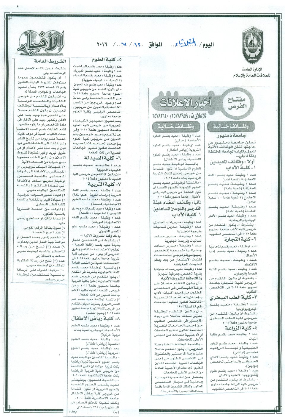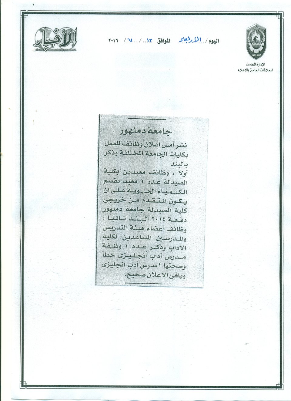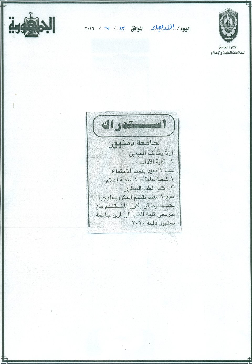 إعلان جامعة دمنهور عن وظائف أعضاء هيئة التدريس والهيئة المعاونة والإستدراك الصادر بجريدتى " الأخبار والجمهورية "