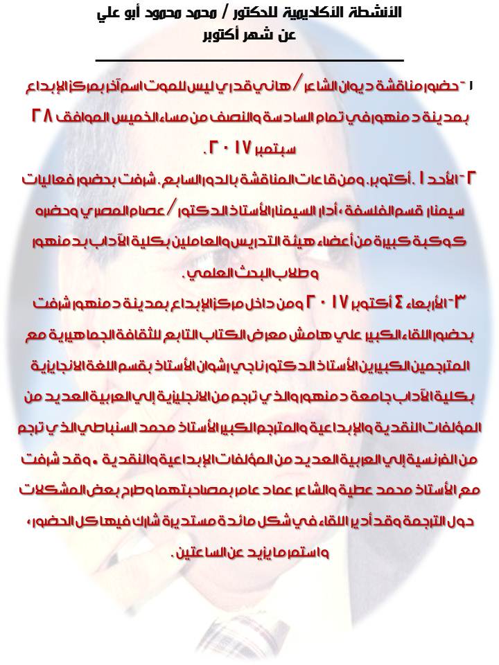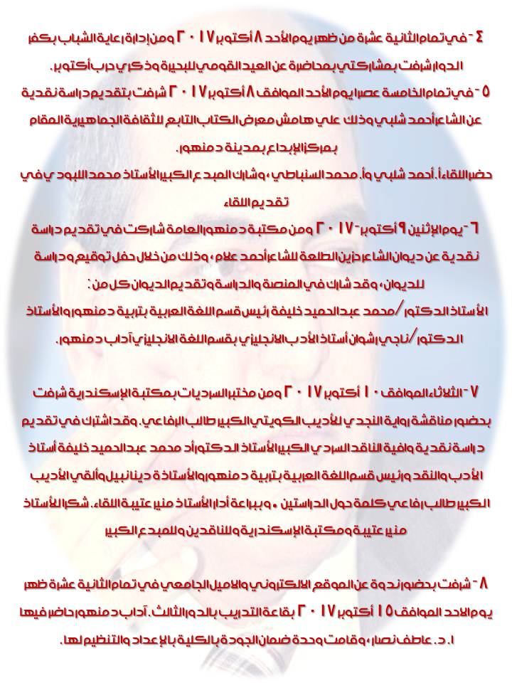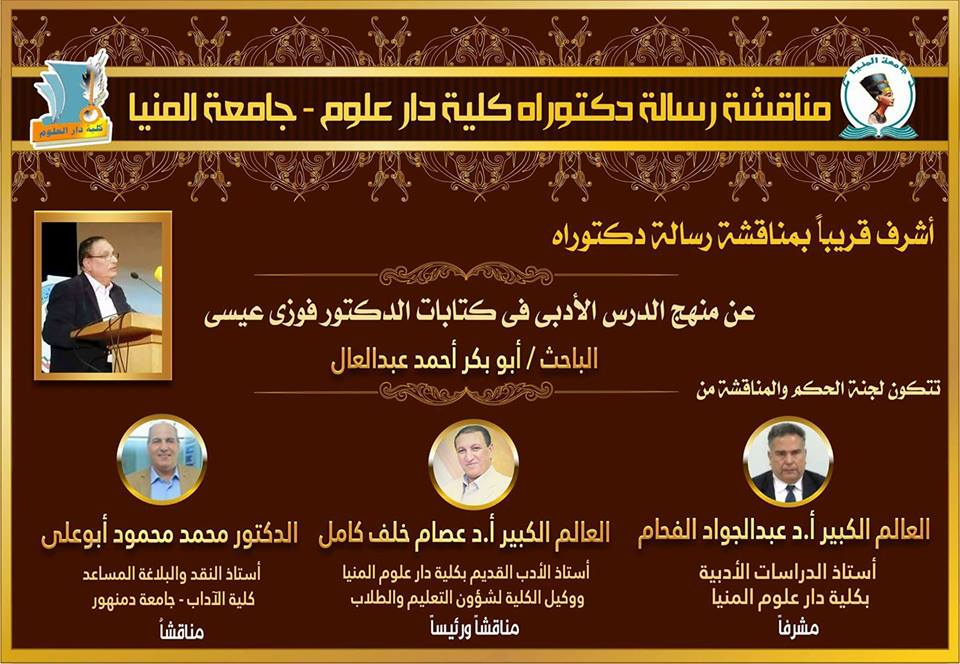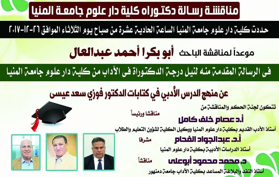 الثلاثاء القادم الموافق 26 ديسمبر 2017 - بإذن الله تعالي - وبكلية دار العلوم جامعة المنيا أشرف بجلوسي - ممتحنا بفتح الحاء- إلي علمين عالمين جليلين ا د.عبدالجواد الفحام واد .عصام خلف كامل وذلك لمناقشة رسالة دكتوراة عن جهود الشاعر الكبير والناقد الخبير الأستاذ الدكتور فوزي سعد عيسي في مجال الدرس الأدبي شكرا لأستاذي الأستاذ الدكتور عبدالجواد الفحام صاحب الدعوة والمشرف علي الرسالة ولأستاذي الأستاذ الدكتور عصام علي جميل فضله ولكل أساتذتي بكلية دار علوم المنيا