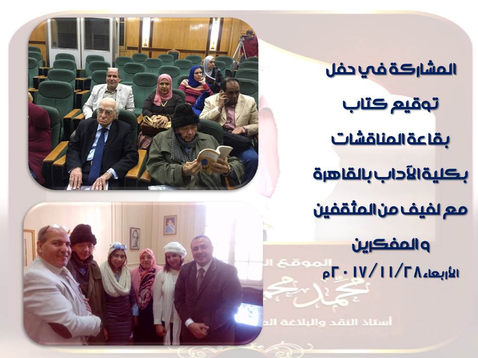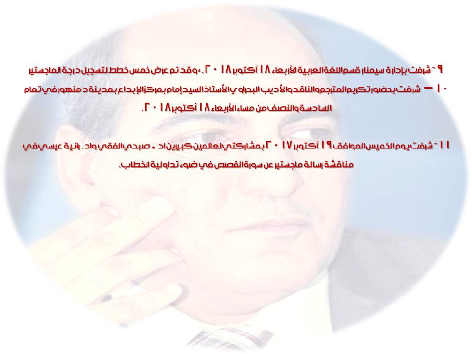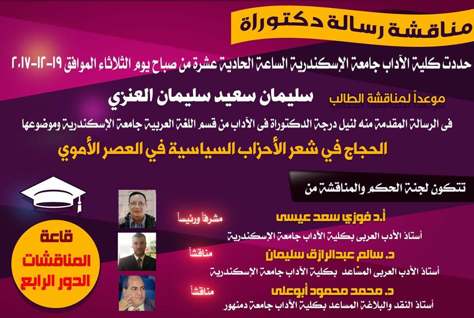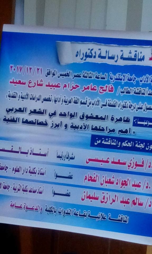 في تمام الساعة الثالثة والنصف من عصر يوم الخميس الموافق 21 ديسمبر 2017 بحضور مناقشة رسالة ماجستير بقسم اللغة العربية بكلية الآداب جامعة الإسكندرية بعنوان : ظاهرة المعشوق الواحد في الشعر العربي ( أهم مراحلها الأدبية وأبرز خصائصها الفنية ) تكونت لجنة الحكم والمناقشة من كل من الناقد الكبير والعالم الجليل الأستاذ الدكتور فوزي سعد عيسي أستاذ الأدب العربي بكلية الآداب جامعة الإسكندرية مشرفا ورئيسا والأستاذ الدكتور عبدالجواد الفحام أستاذ الأدب العربي بكلية دار علوم جامعة المنيا مناقشا. والأستاذ الدكتور سالم عبدالرازق سليمان أستاذ الأدب العربي المساعد بكلية التربية جامعة الإسكندرية. شكرا جزيلا للمشرف والعالم الكبير الأستاذ الدكتور فوزي عيسي وهنيئا للباحث الخلوق فالح عامر حزام عبيد شارع سعيد مبارك لكم